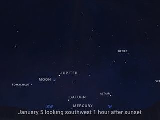 The new year begins with four of the five naked-eye planets strung out along a crooked diagonal line measuring nearly 40 degrees above the south-southwest horizon an hour after sunset.